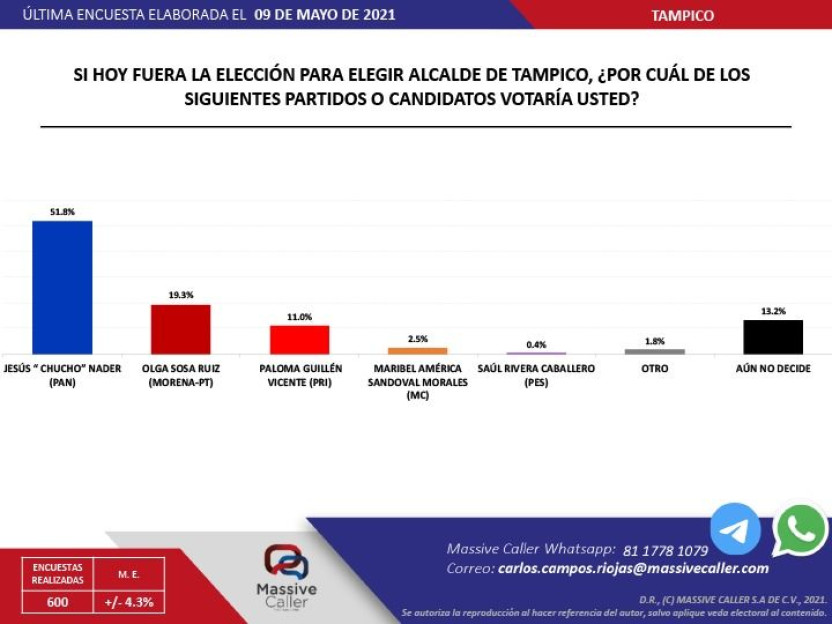 De acuerdo a estos resultados, Chucho Nader, se encuentra con un 51.8 por ciento en las preferencias, luego de la pregunta: Si hoy fuera la elección para alcalde de Tampico, por cuál de los siguientes partidos o candidatos votaría?.