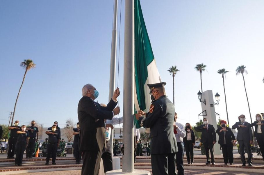 Las actividades iniciaron en la Plaza Cívica Municipal, donde el alcalde Arturo Sanmiguel Cantú izó el lábaro patrio junto al general Roberto Pérez Ceja, Comandante de la Guarnición Militar de la Plaza.