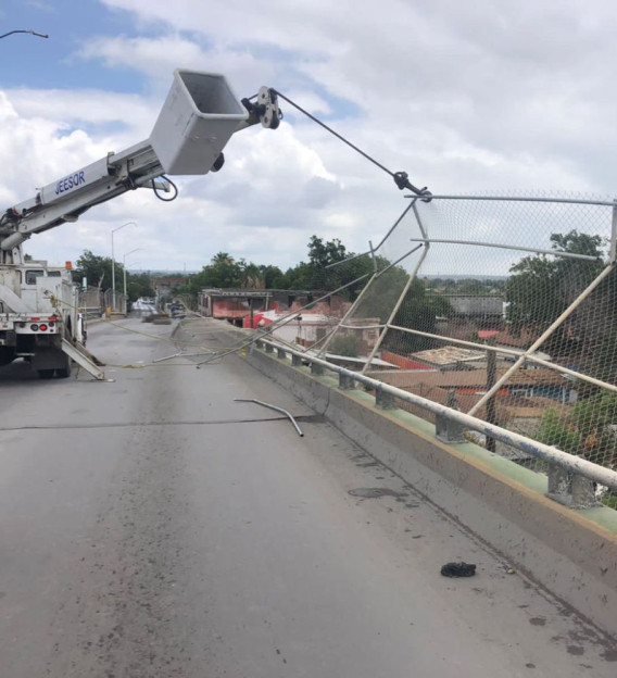 Como parte de las acciones de limpieza derivadas por la tromba, personal de la Secretaría de Obras Públicas retiró la malla ciclónica que resultó dañada en el puente vehicular de la calle Venezuela.