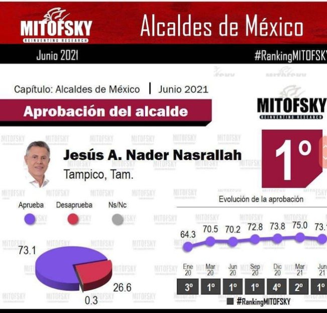 Jesús Nader, alcalde de Tampico, logró la primera posición en el Ranking Mitofski para el mes de junio 2021 y, con ello, suma su séptima ocasión (en el último año y medio) entre los mejores 5 presidentes municipales del País.