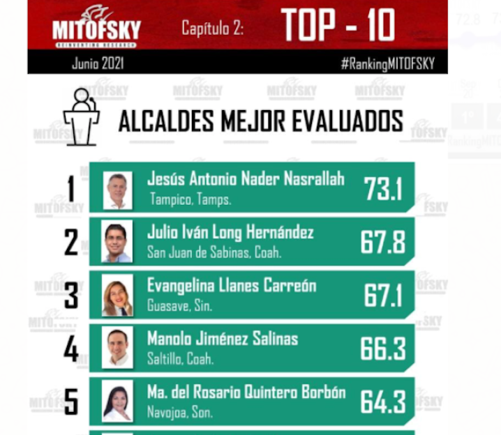 De acuerdo a los resultados arrojados por Mitofski, Nader obtuvo una aprobación ciudadana de 73.1% en tanto que el alcalde Julio Ivan Long (de San Juan de Sabinas, Coahuila) que se colocó en segunda posición alcanzó 67.8%.