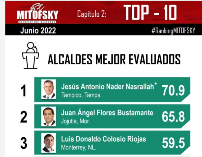 Jesús Nader Nasrallah, presidente municipal de Tampico, se consolidó como el Alcalde con Mayor Aprobación Ciudadana (70.9%) de acuerdo al Top-10 de Consulta Mitofski que en junio de 2022 ha sometido a evaluación a 150 Jefes de Gobierno Municipales en el Pais.