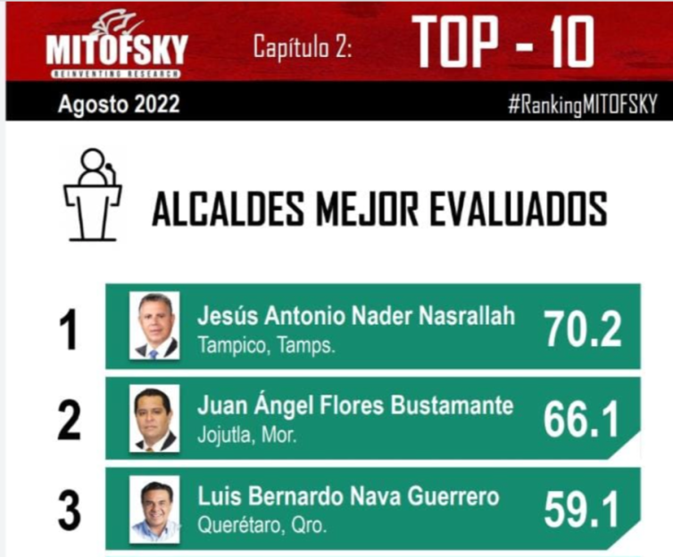 Jesús Nader Nasrallah, alcalde de Tampico, s colocó -por tercera ocasión en 2022- como el alcalde mejor evaluado del País, de acuerdo con los resultaos de la Encuestadora Mitofski presentados para el mes de agosto.