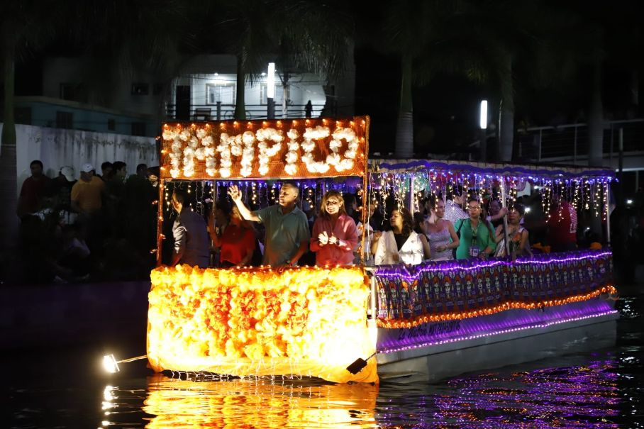 Nuevamente el paseo La Cortadura recibió a miles de familias tampiqueñas y turistas de diferentes entidades para disfrutar de la tradicional procesión náutica “Entre vivos y muertos” en el marco de los festejos de Día de Muertos organizados por el Ayuntamiento de Tampico.