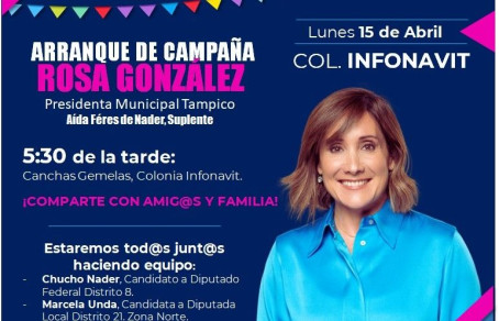 En Tampico, Rosa María González Azcárraga, candidata del PAN a la presidencia municipal de Tampico, comenzará el 15 de abril desayunando (en algún lugar de la ciudad) junto a sus tres compañeros de fórmula: Chucho Nader, candidato a diputado federal por el Octavo Distrito; y Marcela Unda y Pepe Schekaibán, candidatos a las diputaciones locales por los Distritos 21 y 22, respectivamente.