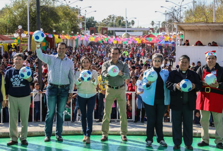 El edil junto al obispo Enrique Sánchez, el padre Rogelio Lozano y demás autoridades que lo acompañaron realizaron una lluvia de balones que otorgó el gobierno del Estado que encabeza Francisco García Cabeza de Vaca, para regalar a los asistentes.