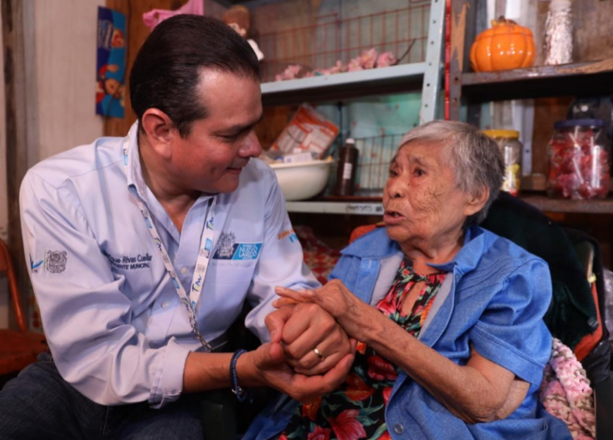 La primer visita fue a Petra Velazquez Mendoza, de 78 años, en el fraccionamiento El Progreso, el alcalde platicó con ella sobre su estado de salud y las necesidades que presenta en su hogar, y ayudó a que le aplicaran la vacuna contra la influenza, además de los medicamentos que requiere.