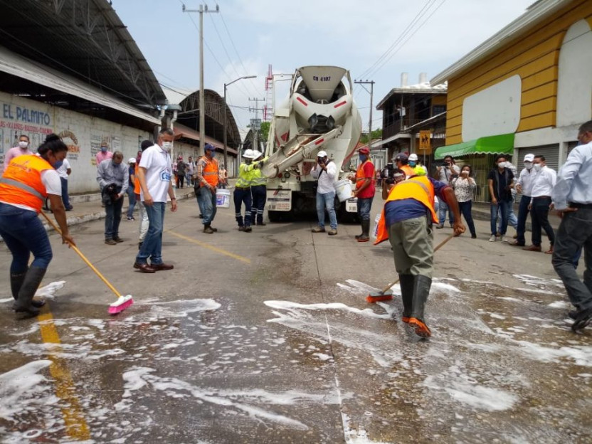En este arranque de campaña de higienización estuvo acompañado del gerente de la compañía cementera Julio Jaramillo, así como de personal de servicios públicos quienes tuvieron la tarea de esparcir el líquido por calles y banquetas aledañas al centro de abasto.