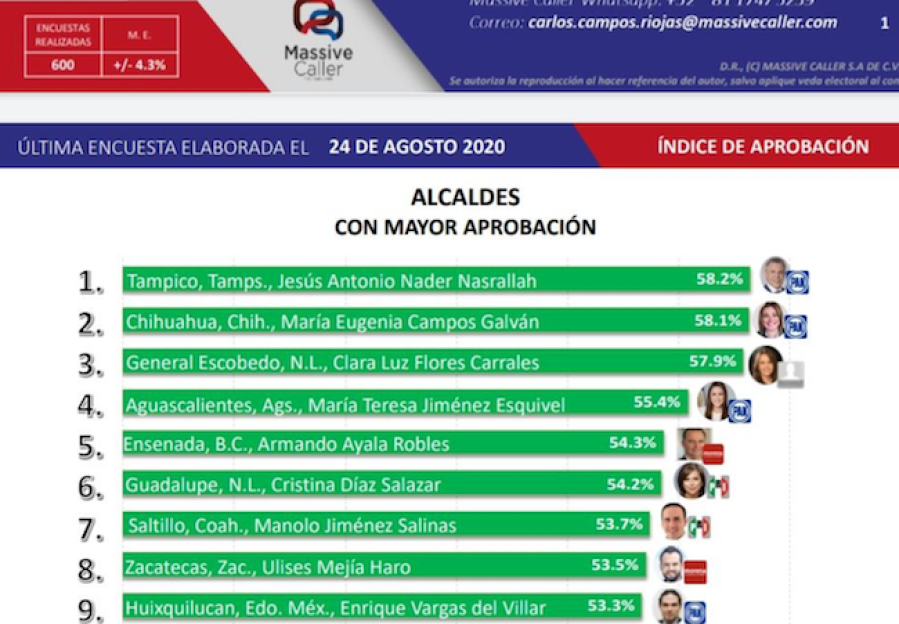 Este resultado consolida a Nader como el alcalde mejor evaluado no solo en la consulta llevada a cabo por Massive Caller sino porque a lo largo de los últimos meses ese resultado se ha desprendido de los trabajos realizados por otras Consultorias como Mitofski.