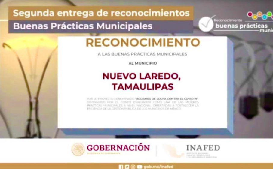 El gobierno federal distinguió por segundo año consecutivo a Nuevo Laredo y entregó a Enrique Rivas Cuéllar el 'Reconocimiento a las Buenas Prácticas Municipales 2020', del programa Guía Consultiva de Desempeño Municipal (GDM), que otorga el Instituto Nacional para el Federalismo y el Desarrollo Municipal (INAFED), por las 'Acciones de Lucha contra el Covid-19'.