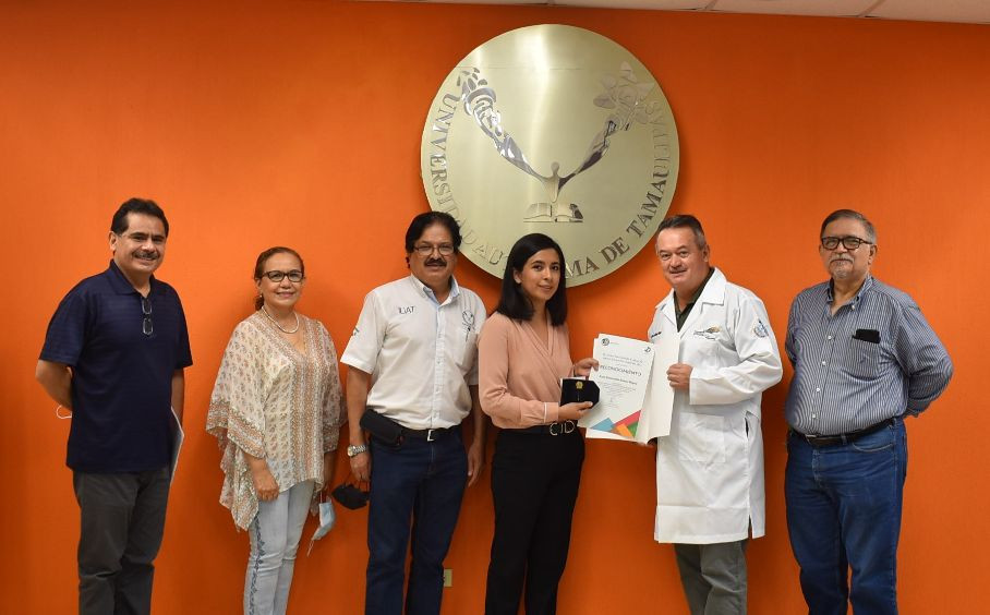 Con la representación del Rector de la UAT, Ing. José Andrés Suárez Fernández, el Director del plantel universitario, Dr. Pedro Luis Mendoza Múzquiz, entregó personalmente el reconocimiento a la alumna Karla Esmeralda Ramos Reyna.