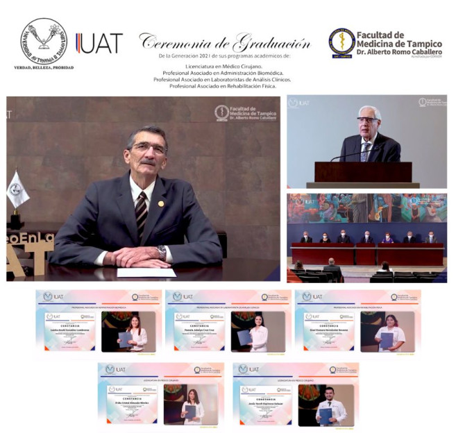 Cumpliendo la misión de formar profesionales útiles a la sociedad, la Facultad de Medicina de Tampico “Dr. Alberto Romo Caballero” de la Universidad Autónoma de Tamaulipas, llevó a cabo la ceremonia de graduación de la generación 2021, realizada en forma presencial en el aula “Dr. Miguel Asomoza Arronte” del Centro Universitario Sur y a distancia mediante las redes sociales.