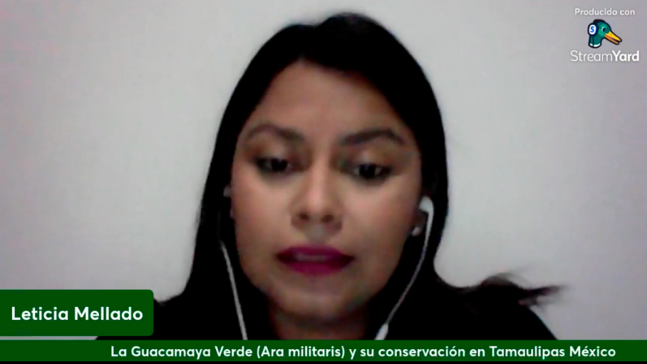 La Maestra en Ecología y Recursos Naturales por la UAT, Mellado Ortiz impartió la conferencia virtual “La Guacamaya Verde (Ara militaris) y su estado de conservación en Tamaulipas, México”, donde habló del trabajo que está realizando en colaboración con investigadores de la casa de estudios para la conservación de esta especie.