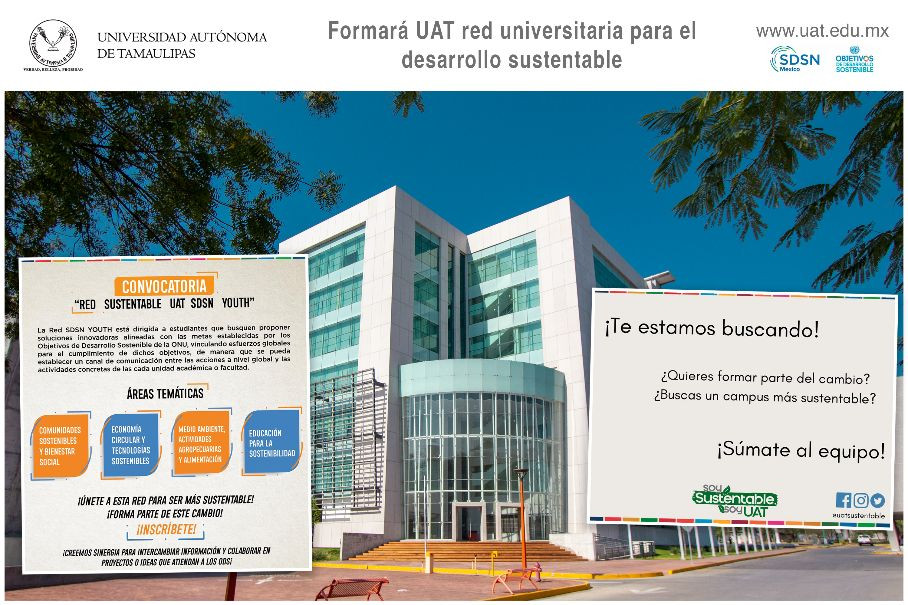 La Secretaría de Investigación y Posgrado de la UAT, por medio de la Dirección de Sustentabilidad, emitió la convocatoria para conformar la Red Sustentable UAT-SDSN YOUTH, con la que invita a ser parte de esta iniciativa a sus estudiantes, así como también al personal administrativo, docentes y externos.