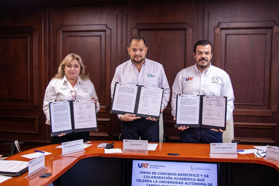 La Universidad Autónoma de Tamaulipas (UAT) y el Colegio de Bachilleres del Estado de Tamaulipas (COBAT) llevaron a cabo la firma de convenios específicos y de colaboración académica que establecen las bases generales y mecanismos que benefician a estudiantes de ambas instituciones en temas de servicio social, apoyo al deporte y fomento a una segunda lengua.