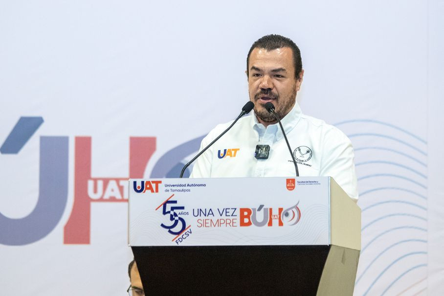 El C. P. Guillermo Mendoza Cavazos, Rector de la Universidad Autónoma de Tamaulipas (UAT), presidió la ceremonia inaugural de la Feria Estatal de Proyectos e Iniciativas Ciudadanas "Juventudes Transformadoras", organizada por la Facultad de Derecho y Ciencias Sociales Victoria (FDSCV) en el marco de su 55 aniversario.