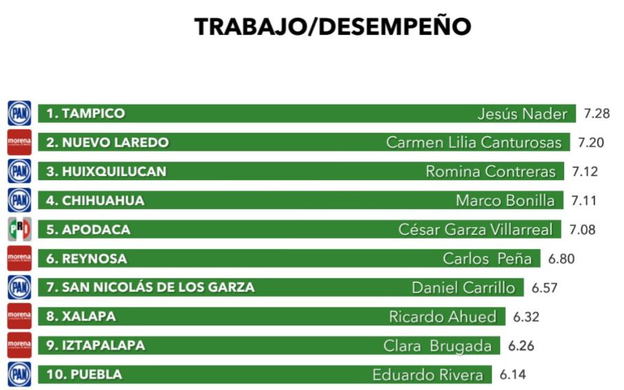 Además, Tampico fue situado como el mejor en Servicios Publicos, y Seguridad gracias a la percepción ciudadana. En esta encuesta, dos alcaldes tamaulipecos fueron elegidos como los mebor posicionados, Nader con un 7.28 de la prefencia ciudadana y Carmen Lilia Canturosas de Nuevo Laredo con un 7.20.