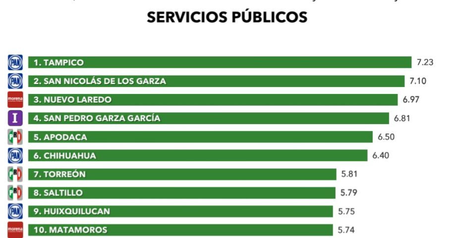En Servicios Públicos, Tampico obtiene la primera posición con un 7.23, seguido de San Nicolás de los Garza, Nuevo León con un 7.10.