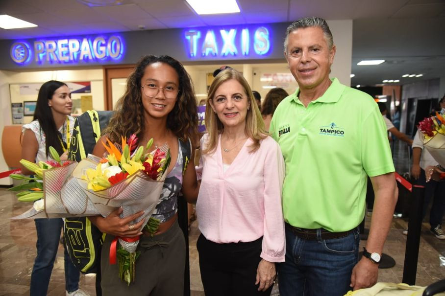 El Presidente municipal Chucho Nader y su esposa, Aída Féres de Nader, Presidenta del Sistema DIF, recibieron esta tarde, en el Aeropuerto Internacional "Francisco Javier Mina" a la tenista canadiense Leylah Annie Fernández, finalista en el Abierto de Estados Unidos y quien tomará parte en el Abierto de Tenis Tampico 2022 a iniciar el próximo lunes 24 de octubre.