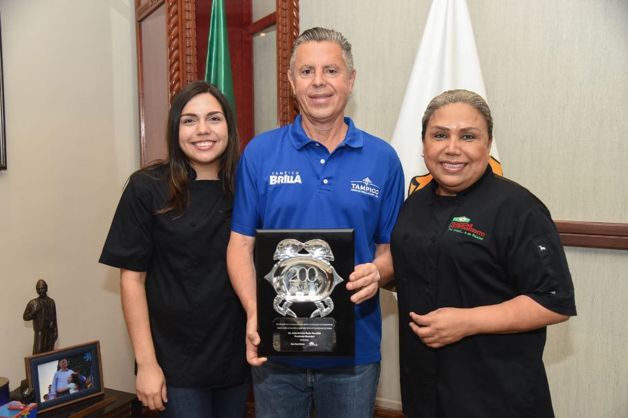 Al recibir el reconocimiento de las empresarias del ramo gastronómico, Martina Gómez y Fabiola Mora Gómez, el mandatario valoró la confianza de la iniciativa privada por seguir desarrollando en Tampico proyectos de ampliación y destino de sus inversiones.