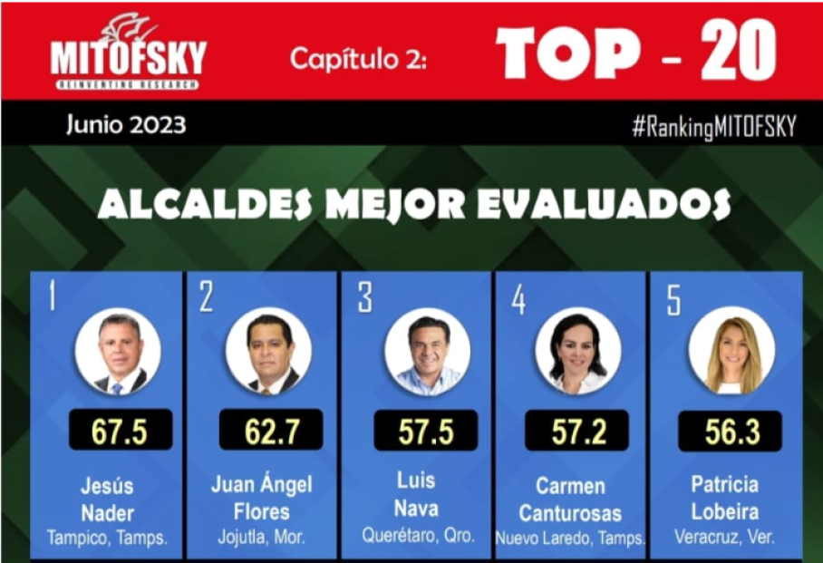 El tamaulipeco alcanzó este sitio de honor al sumar 67.5% en la evaluación relizada por la Consultora correspondiente al mes de junio de 2023 superando los promedios de 149 presidentes municipales mas de todo el País.