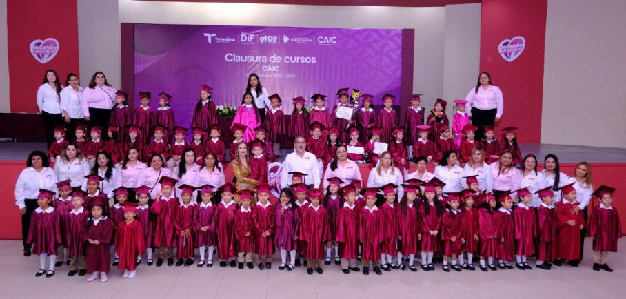 En una emotiva ceremonia el Sistema para el Desarrollo Integral de la Familia (DIF) celebró en el Centro Cívico, la graduación de 91 estudiantes de preescolar de cuatro Centros de Asistencia Infantil Comunitarios (CAIC). El evento inició con los honores a la bandera, cambio de escoltas y el juramento a la bandera por el alumno Diego Luján, actos solemnes que reflejan el compromiso y respeto de los pequeños hacia los símbolos patrios.