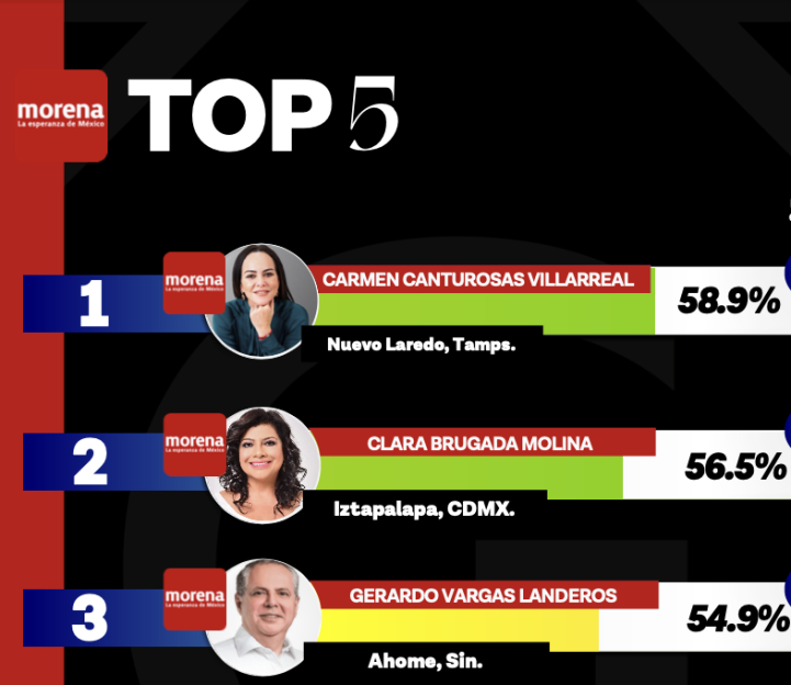 Carmen Lilia también obtuvo un destacado segundo sitio de honor en el 'TOP-5' de alcaldesas mujeres donde se llevó una calificación de 58.9% apenas por debajo del Municipio de Huixquilucan, EDOMEX con apenas una diferencia de un mínimo de 1 punto porcentual.