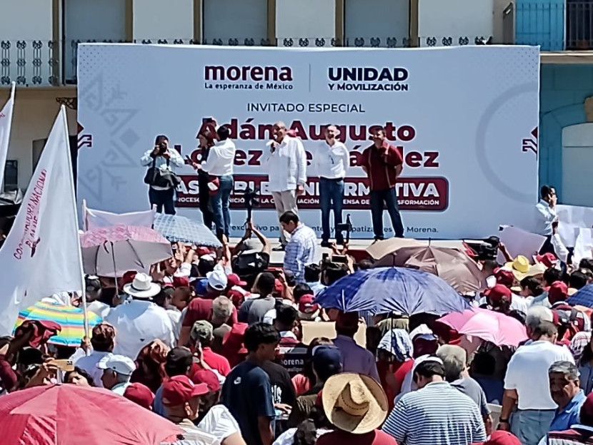 Adán Augusto llegó casi media hora después de la hora propuesta para el evento y solo estuvo media horas en la plaza de la libertad, ya que los rayos solares eran en ese momento insoportables para las no mas de 350 personas que acudieron al sitio.