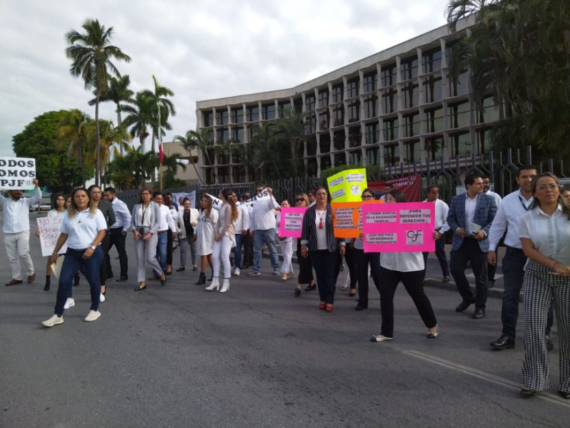 Los trabajadores de los juzgados noveno y décimo Federal salieron a la Avenida Hidalgo en señal de apoyo a las protestas que hoy se realizan de manera simultánea en varias entidades del país, en rechazo a que los diputados federales de Morena, PT y PVEM; y el Presidente de México eliminen 13 de 14 fideicomisos del órgano de gobierno.