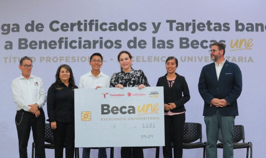 En una emotiva ceremonia, la alcaldesa Carmen Lilia Canturosas Villarreal refrendó su compromiso con la educación de los neolaredenses al realizar la entrega de las tarjetas bancarias a 700 beneficiarios de las Becas UNE para “Título Profesional 2023” y “Excelencia Universitaria 2023” en los que se invirtieron tres millones 946 mil 630 pesos.