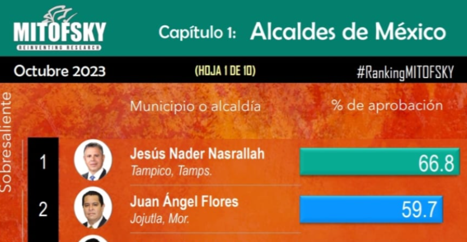 Con un 66.8% de aprobaciín ciudadana en el mes de octubre, Jesús Nader -Alcalde de Tampico- acreditó (por quinta ocasión en 2023) el primer lugar en la evaluación elaborada por la Consultora Mitofsky para El Economista.