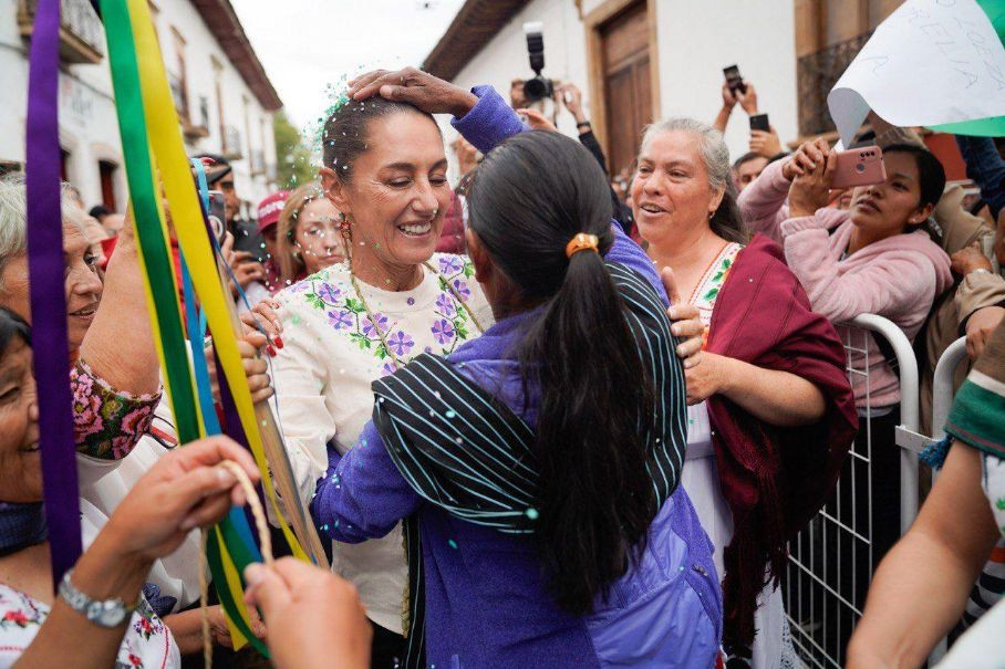 A su llegada, la precandidata de Movimiento Regeneración Nacional (Morena), el Partido del Trabajo (PT) y el Partido Verde Ecologista de México (PVEM), recibió el Bastón de Mando por parte de los pueblos originarios de Michoacán y refrendó su compromiso para no traicionar al pueblo de México y dirigir el rumbo del país bajo los principios de la 4T.