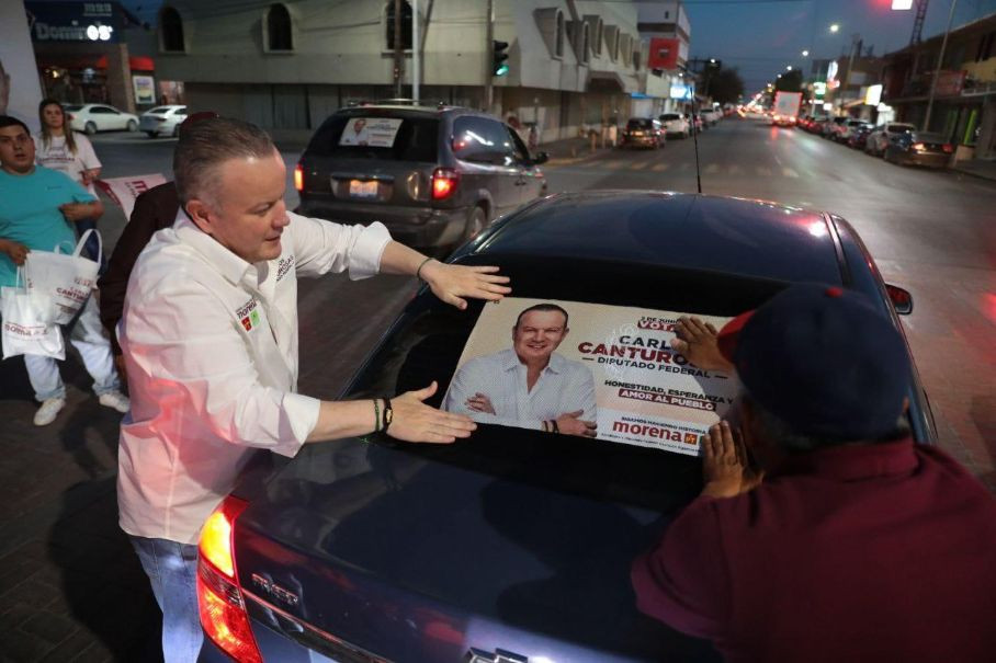 El sonido de los claxons invadió la Avenida Guerrero frente al monumento a Fundadores donde automovilistas y transeúntes que pasaban por el lgar se sumaron al pegoto de Carlos Canturosas Villarreal, candidato a diputado federal por la Coalición 'Sigamos Haciendo Historia en Tamaulipas'.