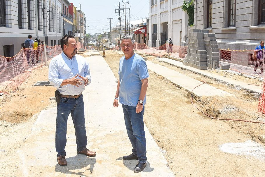 El Presidente municipal Chucho Nader supervisó este día el avance de los trabajos en la conversión de la calle Salvador Díaz Mirón a vialidad semipeatonal, en el tramo comprendido entre Cristóbal Colón y el acceso al nuevo Museo de la Ciudad en la zona centro de Tampico.