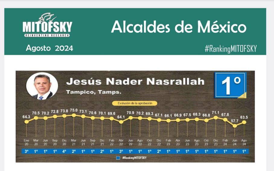 Por tercera ocasión en lo que va del 2024 y prácticamente en la fase final de su Administración el alcalde de Tampico Jesús 'Chucho'Nader sumó -por tercera ocasión en el año- el primer lugar en la evaluación nacional realizada por Consultra Mitofsky.