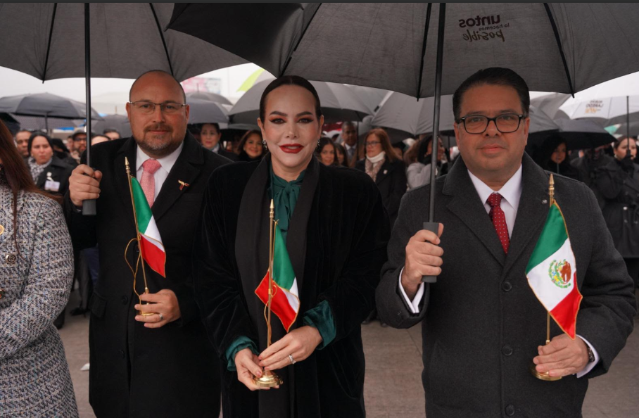 La ceremonia se llevó a cabo con la participación de niños embajadores de ambos países, quienes protagonizaron el tradicional abrazo portando trajes típicos que reflejan la identidad cultural de México y Estados Unidos.
