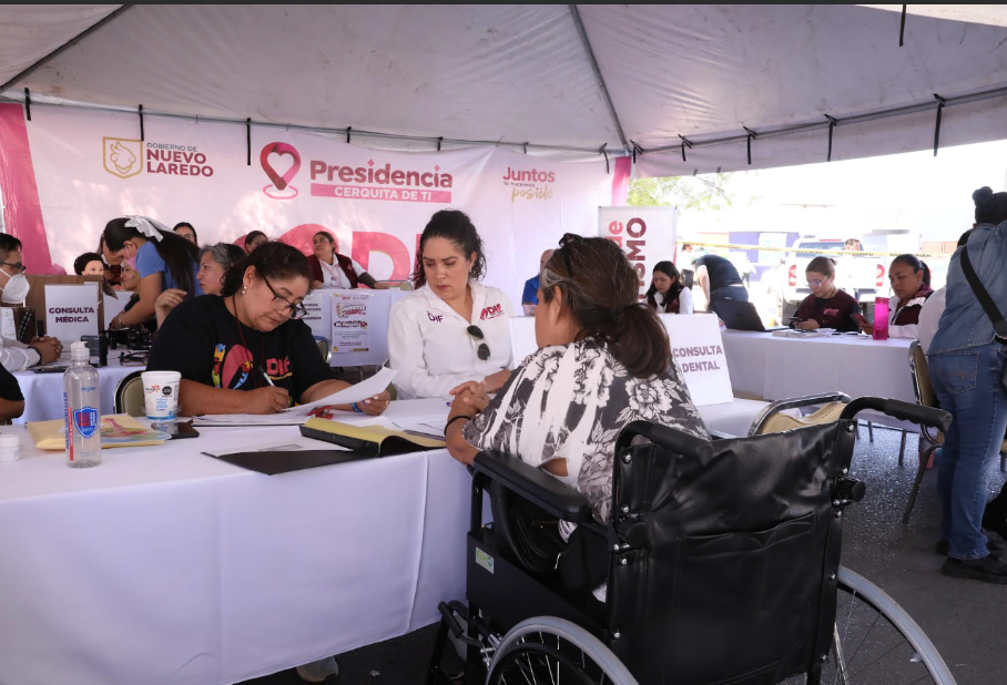 Dentro de la mega brigada, Claudette Canturosas Villarreal, presidentadel Sistema DIF, llevó a una audiencia con vecinos del sector yentregó silla de ruedas, canalizó a ciudadanos para atención médicaespecializada, entre otros apoyos.