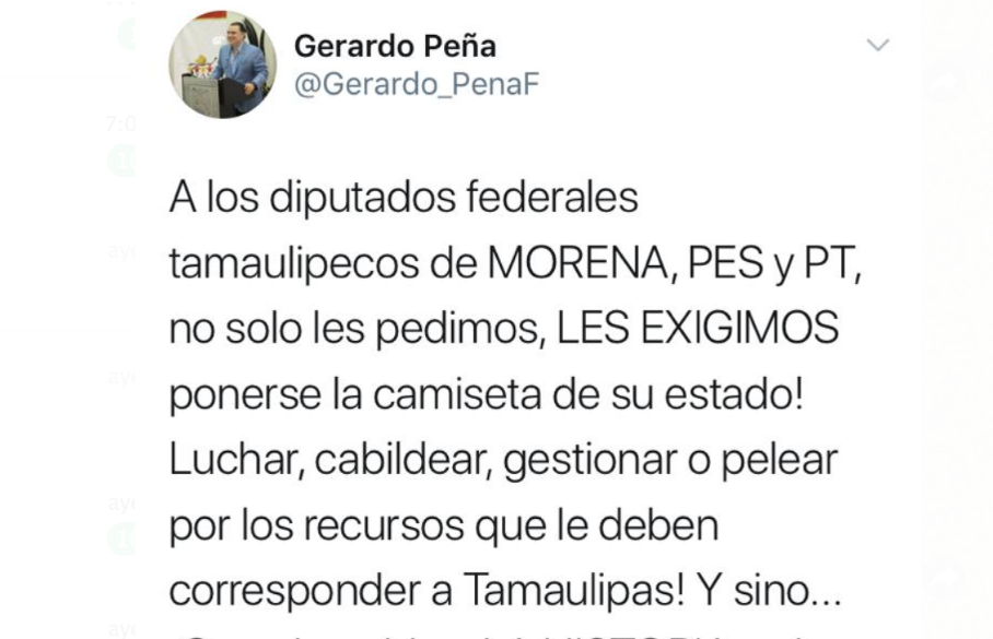 Gerardo Peña Flores, quien es además Coorinador del Grupo Parlamentario del PAN escribió en su cuenta de Twitter un mensaje en el que pide a los Legisladores Federales por Tamaulipas ha que hagan por la entidad. “A los diputados federales tamaulipecos de MORENA, PES y PT, no solo les pedimos, les exigimos ponerse la camiseta de su estado.¡Luchar, cabildear, gestionar o pelear por los recursos que le deben corresponder a Tamaulipas! Y sino… ¡Que el pueblo y la historia se los demande”.
