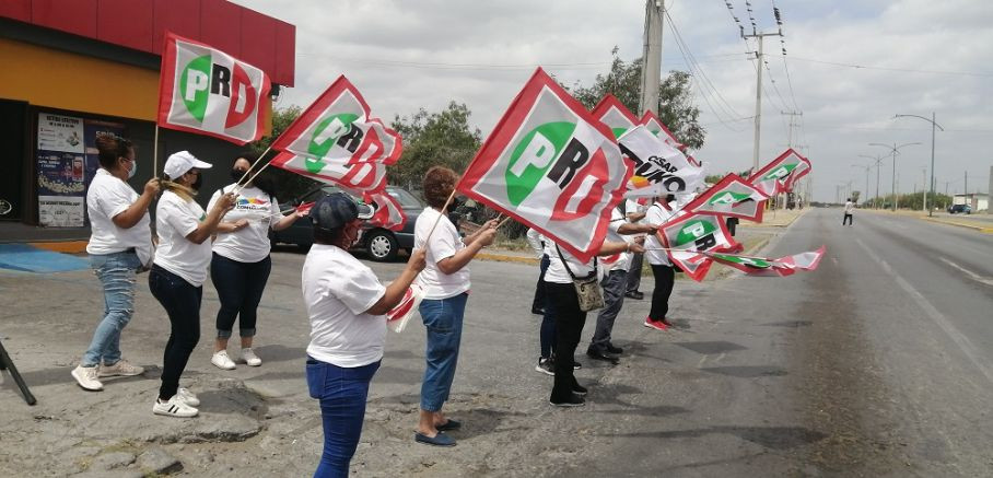 Las brigadas de impacto del Partido Revolucionario Institucional realizaron un pegoteo en la esquina de Monterrey y Municipio Libre, en donde promovieron fuertemente al candidato de la alianza Va por Tamaulipas, César Verástegui Ostos, el Truko.