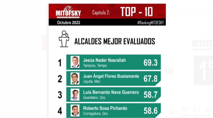 Por cuarta ocasión, en lo que va del 2022, el alcalde Jesús Nader, de Tampico, logró colocarse como el pres idente municipal con mas alta aprobación de acuerdo a la Encuesta Mensual llevada a cabo por la Consultora Mitoksfi.