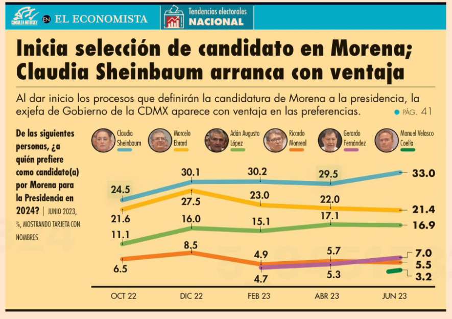 De acuerdo con el “Estudio de opinión a nivel nacional”, elaborado por la empresa Mitofsky para El Economista, a poco menos de un año de que se realice la elección presidencial de 2024, 37.4% de los encuestados respondió que votaría por Morena; 12.7% dijo que lo haría por el PAN y 11.6%, por el PRI.
