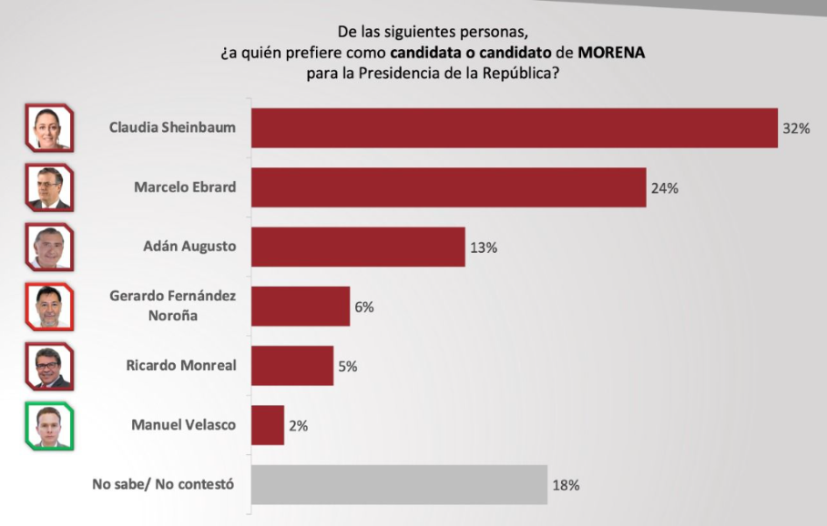 El liderazgo de Sheinbaum se refuerza en todos los atributos evaluados por el estudio, como son: conocimiento (+3%), honestidad (+11%) y cercanía a la gente (+19%), donde sobresale por encima del ex-canciller Marcelo Ebrard Casaubón. Asimismo a Sheinbaum Pardo se la considera como la aspirante con mayor cercanía al presidente de la República (45%) y quien daría mejor continuidad al proyecto político de Andrés Manuel López Obrador (42%).