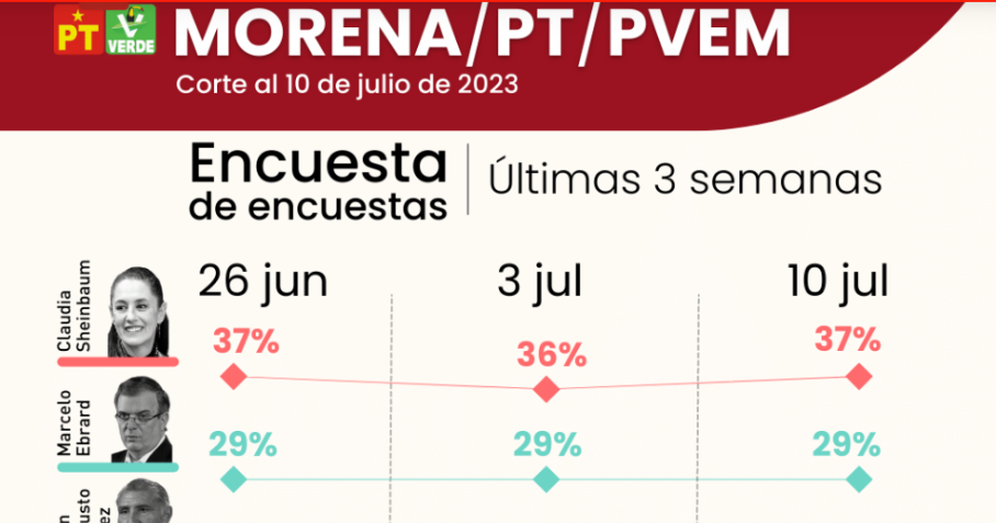 Un balance de las semanas transcurridas arroja que Sheinbaum suma 37% de la intención de voto mientras que Marcelo Ebrard Casaubón registró el 29% y Adán Augusto se mantiene rezagado en tercera posición con 14%.