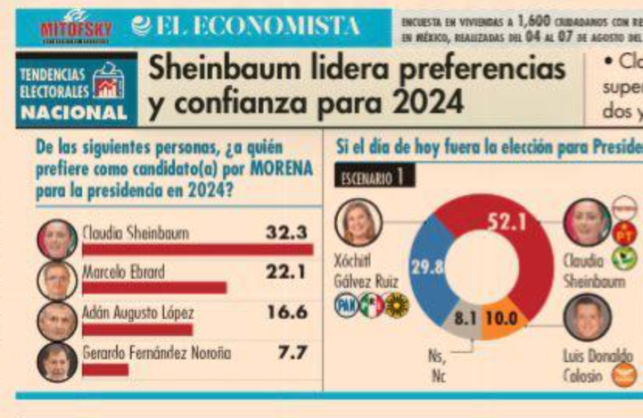 En términos de preferencias electorales, Sheinbaum también resalta, con un 32.3% de los encuestados manifestando su preferencia por ella como candidata de MORENA en las elecciones presidenciales de 2024.
