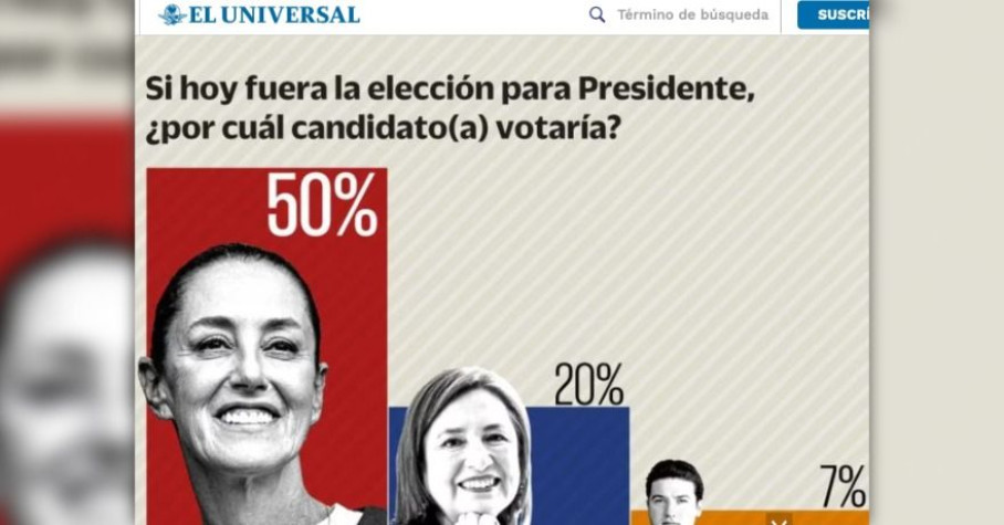 Cuando se presenta a los encuestados un simulacro de boleta electoral con nombres de candidato(a)s (también denominado “careo”), los porcentajes de intención de voto son los siguientes: Claudia Sheinbaum (Morena-PVEM-PT) 50%; Xóchitl Gálvez (PAN-PRI-PRD) 20%; Samuel García (MC) 7%; y Eduardo Verástegui, quien busca ser candidato independiente, 4%. Un 19% de los encuestados no manifestó preferencia por ningún candidato(a).