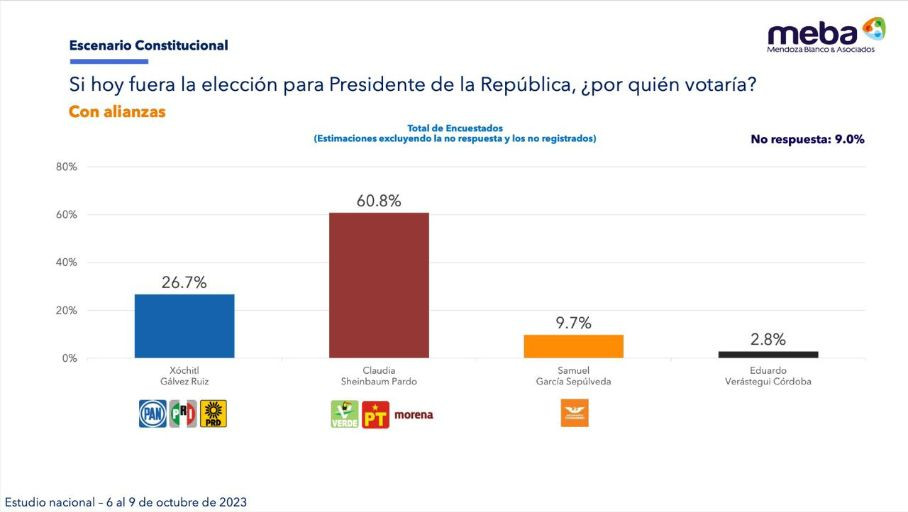 El estudio, llevado a cabo cara a cara en vivienda entre el 6 y el 9 de octubre de este año, le otorga a Sheinbaum una ventaja de +34.1% en su intención de voto para la presidencia de la República sobre Xóchitl Gálvez; ventaja que se amplía hasta un +38.9% en la intención de voto por partido y que llega hasta el +51% en lo relativo a la expectativa de triunfo durante la próxima elección presidencial.