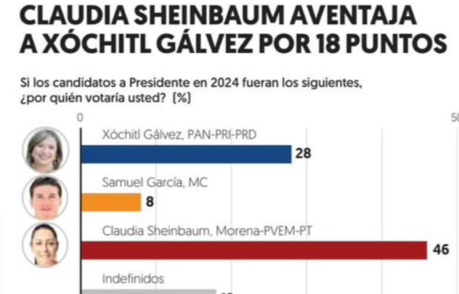 Sheinbaum, como abanderada de la coalición Morena-PVEM-PT, cuenta con 46 por ciento de las preferencias, mientras que Gálvez capta 28 por ciento; Samuel García, como posible abanderado de MC, 8 por ciento, con 18 por ciento de indefinidos. En un escenario con Marcelo Ebrard como la opción naranja, Sheinbaum confirma 46 por ciento de apoyo, Gálvez cuenta con 27 por ciento y Ebrard, con 9 por ciento, nuevamente con 18 por ciento de indefinidos. En este segundo escenario, la ventaja de Sheinbaum sobre Gálvez es de 19 puntos.