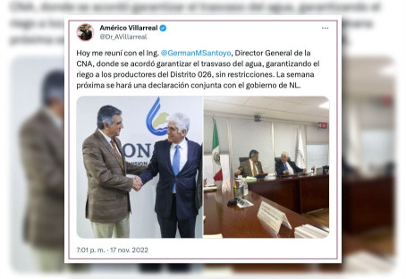 “Hoy me reuní con el Ingeniero Germán M. Santoyo, Director General de la CNA, donde se acordó garantizar el trasvaso de agua, garantizando el riego a los productores del distrito 026, sin restricciones. La semana próxima se hará una declaración conjunta con el gobierno de NL”.