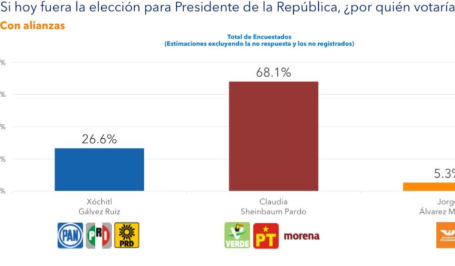 La casa encuestadora publicó su más reciente Estudio Nacional de Clima Político este miércoles 24 de enero, donde destaca que la candidata de Morena, PT y PVEM tiene una ventaja del 61.8 por ciento de intención de voto, en comparación con el 31.7 por ciento de la candidata de PAN-PRI-PRD, y 6.5 por ciento de Jorge Álvarez Máynez, de Movimiento Ciudadano.