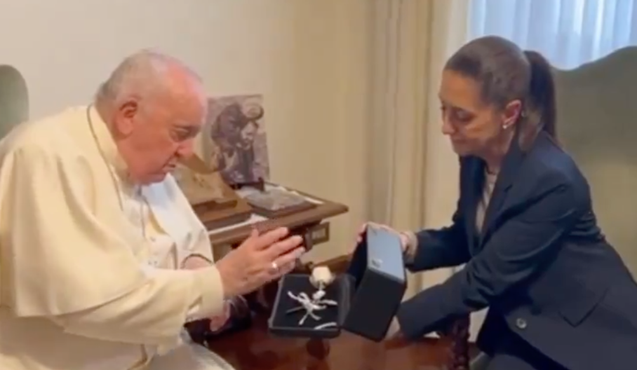 “Pensando en la devoción de las y los mexicanos por la Virgen de Guadalupe, le pedí al Papa Francisco que bendijera una rosa de plata elaborada por Adrian Pallarols para llevarla a México”, compartió Claudia Sheinbaum a través de sus redes sociales, donde mostró un fragmento sobre su reunión con el Papa Francisco.